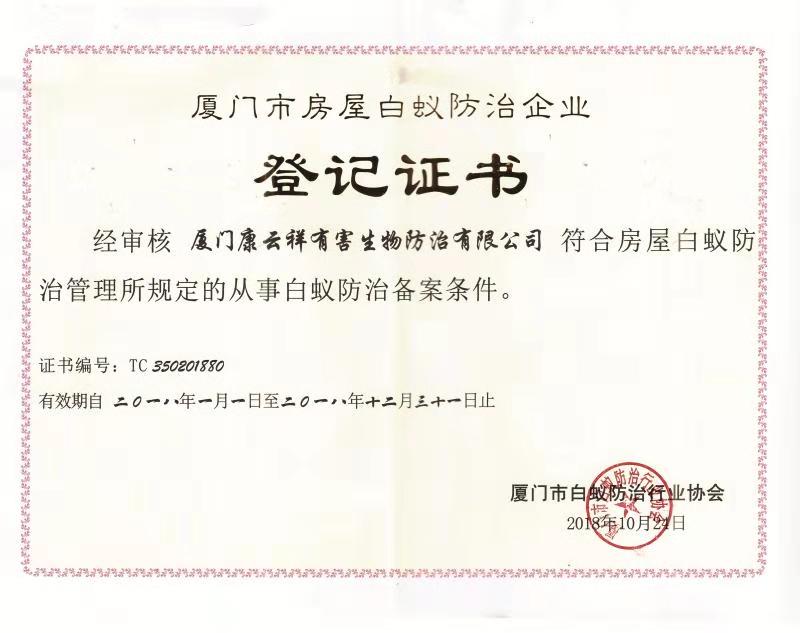 廈門(mén)康云祥有害生物防治有限公司是2010年經(jīng)廈門(mén)市工商局注冊(cè)、市衛(wèi)生局愛(ài)衛(wèi)辦《廈門(mén)市除四害管理辦法》的要求已備案的專(zhuān)業(yè)除四害消殺公司,是具備白蟻防治資質(zhì),證書(shū)編號(hào):350201880的專(zhuān)業(yè)白蟻防治單位, 是衛(wèi)生有害生物防制協(xié)會(huì)會(huì)員單位,是專(zhuān)門(mén)從事房屋白蟻預(yù)防,單位及家庭白蟻綜合治理,土建白蟻預(yù)防,裝修白蟻預(yù)防,古樹(shù)園林綠化廠(chǎng)房白蟻治理與四害